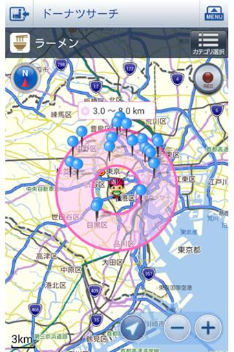 自転車NAVITIMEでは、目的地を検索するときに、周辺のおすすめスポットを検索することができます。NAVITIMEでよく検索される場所や、TVで紹介された話題の場所などを、距離と方角、説明つきで表示できます。さらに、地図上の任意の場所を長押しすると、その周囲にあるカフェやコンビニ、ラーメン店や駐輪場、温泉などを表示し、目的地に設定できるドーナツサーチ機能があります。検索範囲はドーナツの輪の部分をドラッグすることで変更できます。