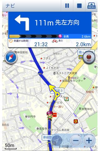自転車NAVITIMEは、見やすく色分けされた地図上に自転車にのったキャラクターが現在地に表示されます。目的地はテキスト入力の他、行きたい場所を地図上で長押しして設定もできます。目的地を設定すると、ナビゲーションが開始されます。無料版では距離が短いルートしか表示されませんが、走行時間や距離に加え、グラフで高低差なども表示されます。ルートが地図上に表示される他、画面上部には現在のスピードとあと何メートルで左折などの案内が表示されます。寄り道などでルートから外れた場合も自動的に再設定することができます。また、自転車や徒歩で路地を通る場合など複数地点を結んだ距離を測りたいときには、同じ無料アプリのキョリ測があります。